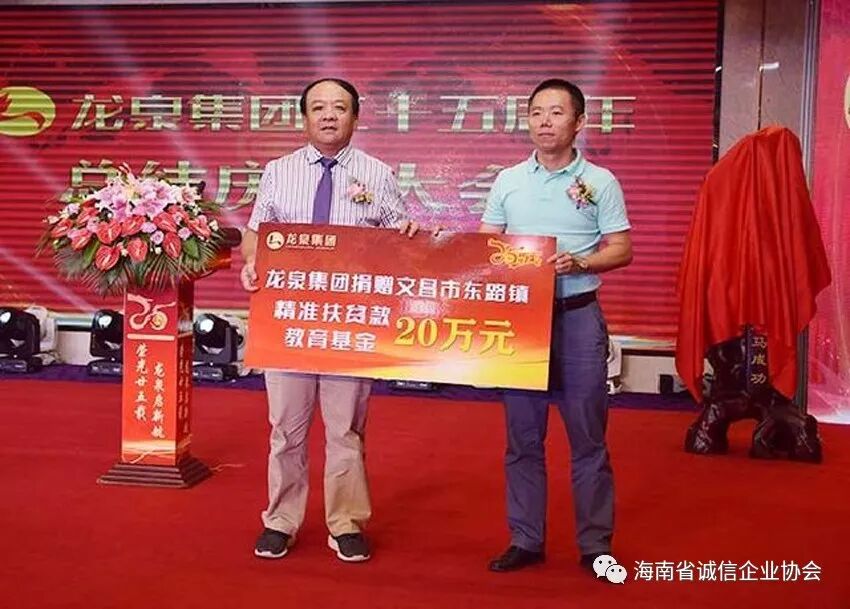 在25周年慶典現場,龍泉集團向文昌市東路鎮政府捐贈20萬元,用于支持當地精準扶貧及教育基金善款。